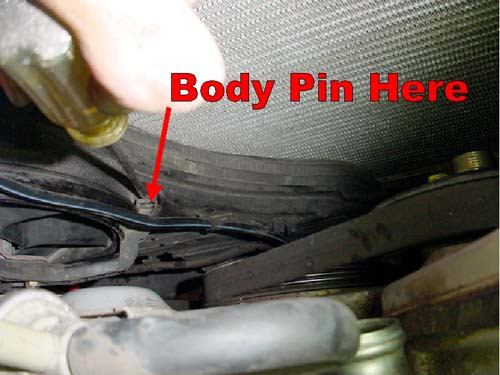 The electric fan removal is a little trickier. First, remove the body pin holding the fan in place- it is located on the fan shroud towards the center of the engine and lower (it would appear at 8:00 if you look at the fan from the front of the car). Use a long flat-blade screwdriver to break the pin- there is no way to remove without breaking it. See photo.