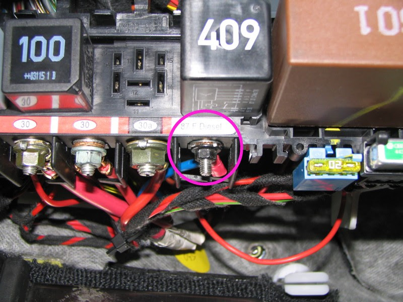 d) Connect the (red) +12V wire to the right-most terminal of the relay panel, which reads "87 F Diesel":